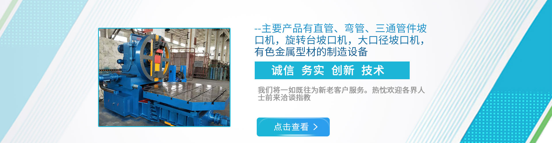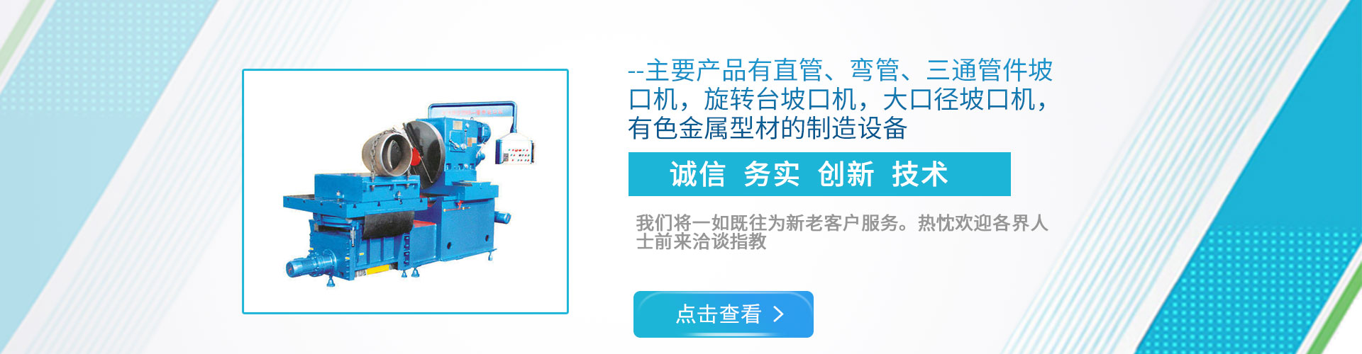 公司現(xiàn)下轄兩個分廠,一分廠主營電動管道坡口機和焊接設(shè)備,適用于造船、電力工程安裝、石油、化工、鍋爐廠、冶金以及鋼鐵行業(yè); 二分廠主營雙頭坡口機,600mm直管坡口機和金屬型材擠壓生產(chǎn)線,適用于銅、鋁、鎂、鉛、鋅等有色金屬及其合金的加工。